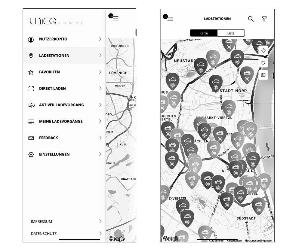 Du hast Zugang über eine benutzerfreundliche App mit Übersicht aller UNIEQ-Power Ladepunkte und Start des Ladevorgangs direkt am Smartphone.